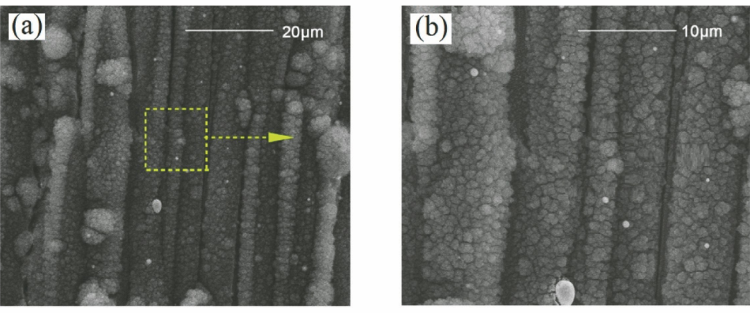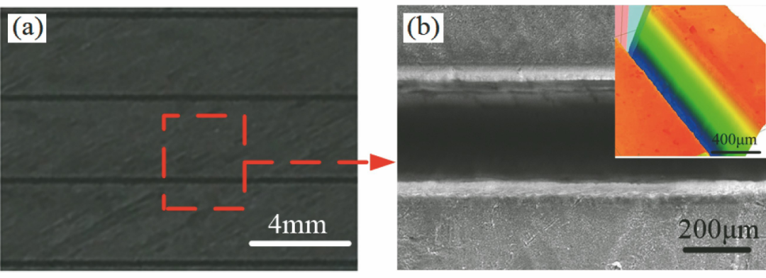 為了控制CMC-SiC中由激光熱作用導(dǎo)致的加工缺陷利用超短脈沖激光對(duì)CMC-SiC 進(jìn)行精密加工成為國(guó)內(nèi)外學(xué)者研究的熱點(diǎn)。蔡敏等對(duì)比了納秒激光和皮秒激光的SiC/SiC加工效果,結(jié)果表明:納秒激光加工過(guò)程中材料表面同樣存在熱影響區(qū),導(dǎo)致激光輻照區(qū)域產(chǎn)生了重鑄層、分層及微裂紋等缺陷;利用皮秒激光加工,相對(duì)納秒激光,SiC/SiC的加工質(zhì)量有顯著提高,激光輻照區(qū)域未發(fā)現(xiàn)熱影響區(qū),即重鑄層、分層、微裂紋等缺陷在皮秒激光加工中得到了有效抑制。Liu等利用皮秒激光開展了C/SiC的微孔加工實(shí)驗(yàn),研究發(fā)現(xiàn):當(dāng)激光功率密度較低時(shí),孔內(nèi)形成的反沖氣壓同樣較低,導(dǎo)致孔內(nèi)碎屑不能有效噴出;升高激光功率密度后,加工過(guò)程中孔內(nèi)產(chǎn)生強(qiáng)烈的沖擊波,形成的反沖高壓使得碎屑從孔內(nèi)高速向外噴射,微孔加工質(zhì)量明顯提高。Moreno等開展了飛秒激光加工纖維增強(qiáng)復(fù)合材料的實(shí)驗(yàn)研究,發(fā)現(xiàn)內(nèi)部基體材料的尺寸和形狀對(duì)激光加工質(zhì)量存在較大影響。在飛秒激光參數(shù)的合理調(diào)控下,纖維增強(qiáng)復(fù)合材料獲得了良好的加工質(zhì)量。Zhai等在SiC/SiC上利用飛秒激光進(jìn)行了多種微結(jié)構(gòu)的制備研究,檢測(cè)報(bào)告顯示SiC/SiC加工區(qū)域輪廓清晰,沒有出現(xiàn)機(jī)械加工常見的崩邊、纖維拔出,以及長(zhǎng)脈沖激光加工中明顯的熱影響區(qū)。為了驗(yàn)證加工效果,利用飛秒激光在SiC/SiC表面制備了大面積的微槽結(jié)構(gòu),加工效果如圖8所示。