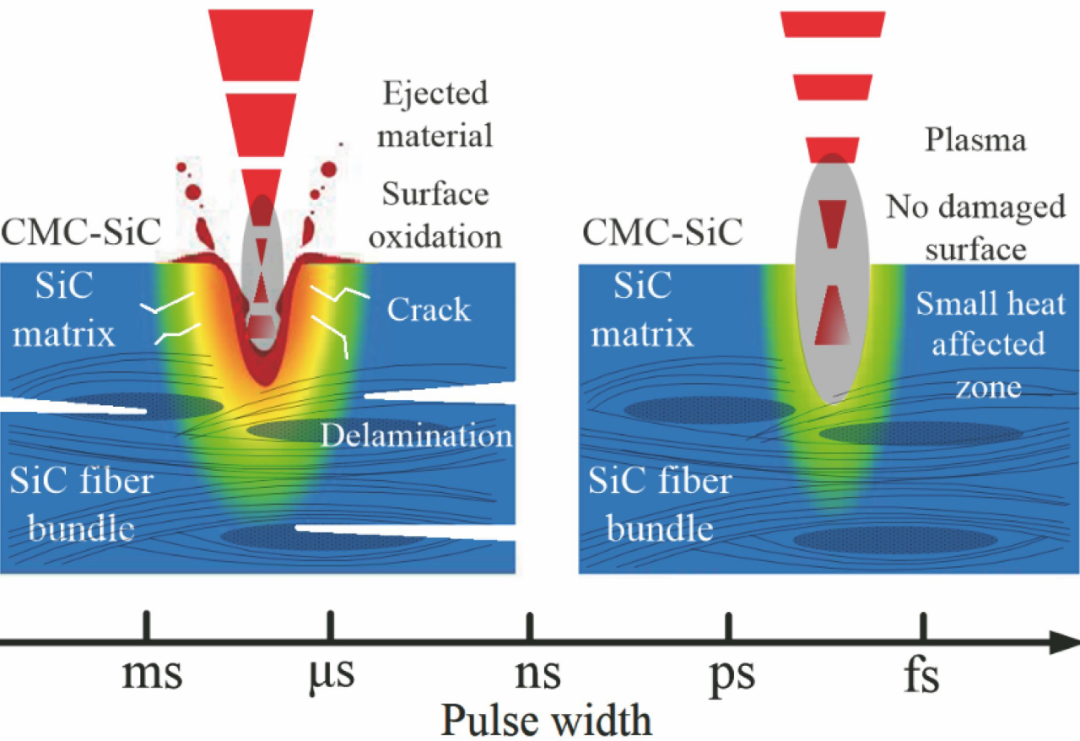 脈沖寬度是影響激光束與材料相互作用的重要因素,脈沖激光包括長(zhǎng)脈沖激光(>100 ns)、短脈沖激光(10 ps~100 ns)及超短脈沖激光(<10 ps),不同脈寬激光與CMC-SiC的作用機(jī)理如圖9所示。連續(xù)激光及大功率長(zhǎng)脈沖激光作用下,CMC-SiC的材料去除主要依靠熱累積所引起的熔化與氣化;納秒激光屬于短脈沖激光,在CMC-SiC加工中產(chǎn)生的熱作用相對(duì)較小,CMC-SiC的刻蝕過(guò)程中包含光熱與光化學(xué)兩種作用;皮秒及飛秒激光的脈沖寬度極短,CMC-SiC表面刻蝕中幾乎不存在熱作用。在光化學(xué)作用下,材料連續(xù)吸收光子能量后發(fā)生電離,產(chǎn)生的等離子體高速噴射而出,CMC-SiC的材料去除通過(guò)相爆炸、庫(kù)倫爆炸、光子機(jī)械破損等效應(yīng)的耦合作用完成。因此,超短脈沖激光憑借脈沖持續(xù)時(shí)間短、峰值功率密度高的特性,可用于實(shí)現(xiàn)CMC-SiC的非熱熔性冷加工。